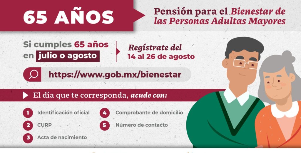 Del 14 al 26 de agosto se realizará en todo el estado de Michoacán el registro para la incorporación a la Pensión para el Bienestar de las Personas Adultas Mayores, para quienes cumplen 65 años entre los meses de julio y agosto o rezagados.