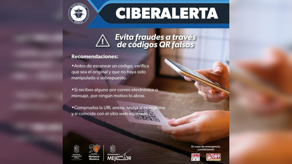 Morelia, Michoacán, 18 de marzo de 2025.- Ante el alza de delitos cibernéticos en la entidad, la Secretaría de Seguridad Pública (SSP) emite una alerta por fraudes efectuados a través de códigos QR.