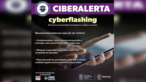 Morelia, Michoacán.- Cualquier tipo de ciberacoso puede tener un impacto emocional fuerte, por lo que es importante buscar apoyo de autoridades, amigos, familiares y especialistas para procesar la agresión y realizar las acciones legales competentes, es por ello que la SSP lanzó una aleta ante la presencia del cyberflashing (ciber-exhibicionismo).