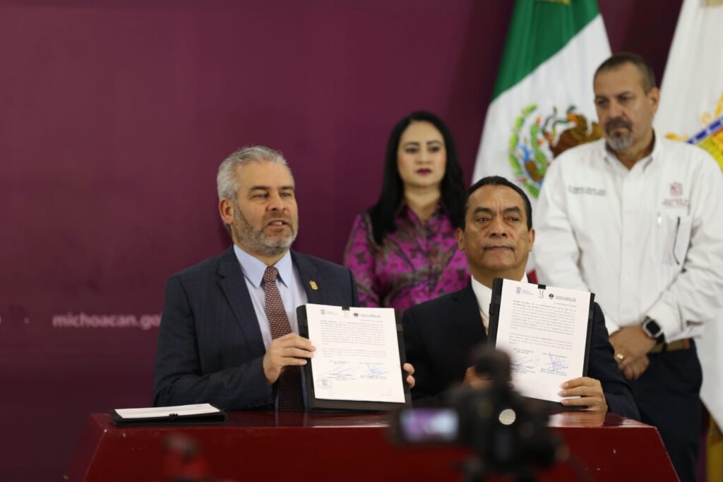 Morelia, Michoacán,12 de febrero de 2024.- El gobernador Alfredo Ramírez Bedolla firmó el decreto por el que se declara la implementación en Michoacán del sistema de vigilancia satelital “Guardián Forestal”, así como un convenio con la Fiscalía General del Estado (FGE) a fin de darle validez legal a la información que este emite sobre daños al medio ambiente y dar seguimiento a las denuncias por delitos contra el medio ambiente.