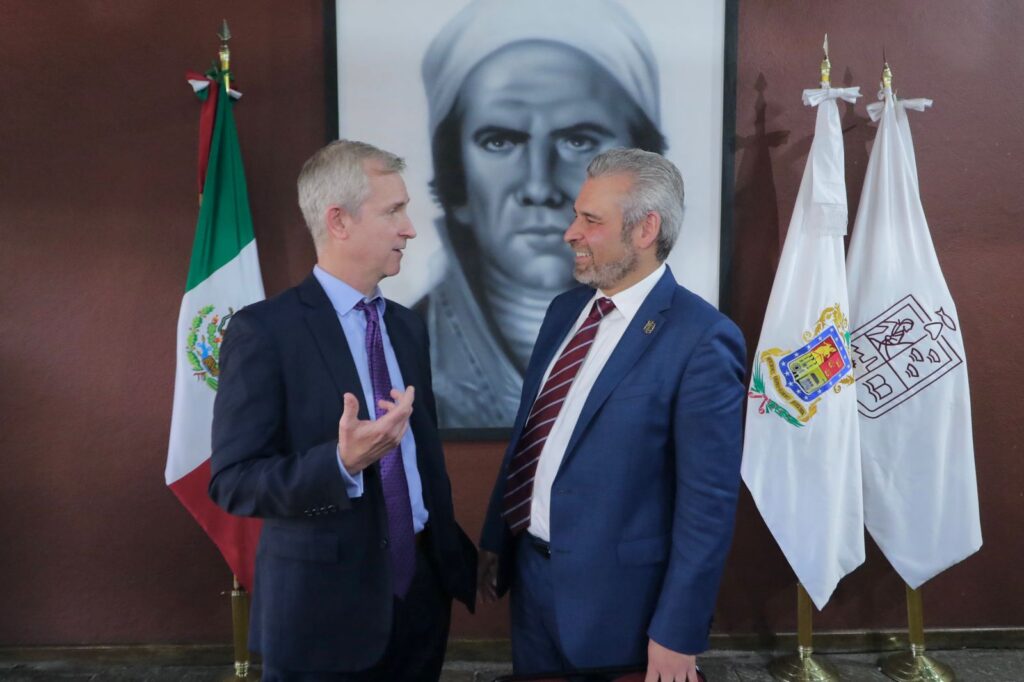 Morelia, Michoacán.- El gobernador Alfredo Ramírez Bedolla refrendó al ministro consejero de Seguridad para la Embajada Americana en México, Timothy Dumas, el compromiso de otorgar facilidades para implementar esquemas de acompañamiento y protección a trabajadores de USDA-APHIS (Servicio de Inspección Animal y Vegetal) en Michoacán.
