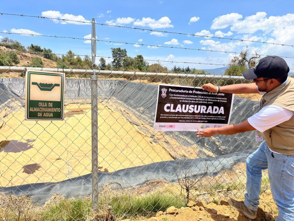 Erongarícuaro, Michoacán, 15 de junio de 2024.- La Procuraduría de Protección al Ambiente (Proam) llevó a cabo la clausura de cuatro ollas para uso agrícola en el municipio de Erongarícuaro, al no contar con la Autorización en Materia de Impacto Ambiental, tal y como indica la Ley para la Conservación y Sustentabilidad Ambiental del Estado de Michoacán.