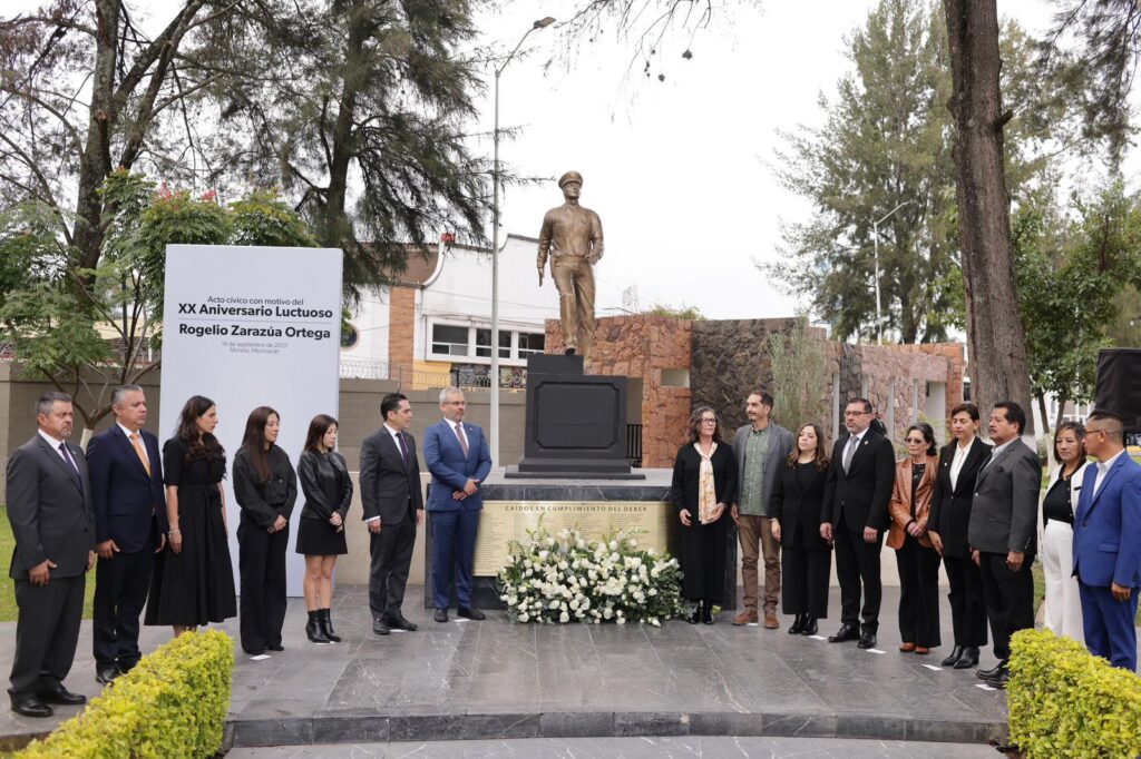 Morelia, Michoacán, 16 de septiembre de 2025.- El gobernador Alfredo Ramírez Bedolla encabezó el vigésimo Aniversario Luctuoso de Rogelio Zarazúa Ortega, quien se desempeñó como director de Seguridad Pública del estado.