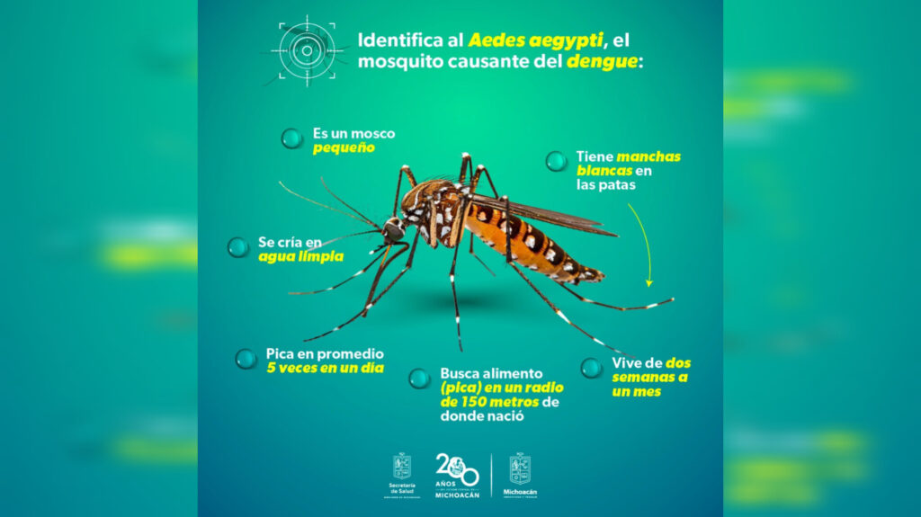 Morelia, Michoacán, 20 de julio de 2024.- Para prevenir el dengue en tu hogar y comunidad, la Secretaría de Salud de Michoacán (SSM) explica cómo luce y se reproduce el mosquito _Aedes aegypti, transmisor de la enfermedad.