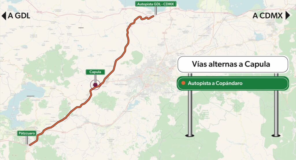Morelia, Michoacán, 15 de octubre de 2024.- La Secretaría de Comunicaciones y Obras Públicas (SCOP) da a conocer a turistas y visitantes las rutas alternas para llegar a la tenencia de Capula, donde, del 20 de octubre al 3 de noviembre, se desarrollará la 14 Feria Nacional y Cultural de la Catrina.
