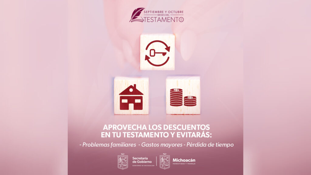 “Invitamos a las y a los michoacanos a aprovechar los descuentos ofertados por el Colegio de Notarios de Michoacán por concepto de trámites testamentarios, que se aplican desde el primer día de septiembre y que continuarán hasta el último día de octubre”, apuntó.