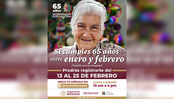 Ciudad de México.- El Gobierno de México, a través de la Secretaría de Bienestar, informa que del 13 al 25 de febrero se realiza el registro para la incorporación a la Pensión para el Bienestar de las Personas Adultas Mayores para quienes cumplen 65 años entre enero y febrero de 2023.