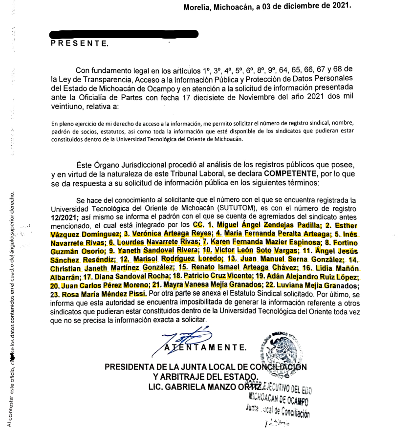 Maravatío, Michoacán.- Profesores y trabajadores de la Universidad Tecnológica del Oriente de Michoacán (UTOM) informaron de una serie de presuntas irregularidades en la formación del Sindicato Único de Trabajadores de la Universidad Tecnológica del Oriente de Michoacán (SUTUTOM) con número de registro 12/2021.