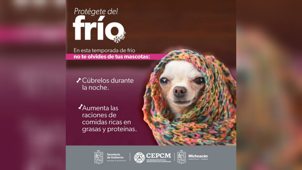 Morelia, Michoacán.- Con las temperaturas mínimas que se registran en Michoacán, la Secretaría de Gobierno, a través de la Coordinación Estatal de Protección Civil, exhorta a la población a resguardar del frío a sus mascotas.