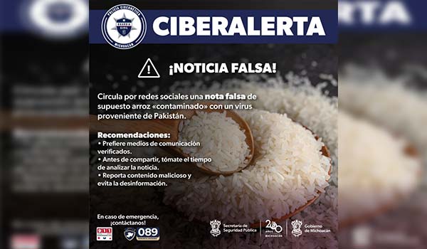 Morelia, Michoacán, 14 de marzo de 2024.- La Secretaría de Seguridad Pública (SSP), a través de la Policía Cibernética, emite una serie de recomendaciones para evitar la difusión de noticias falsas sobre la venta de arroz contaminado de origen pakistaní.