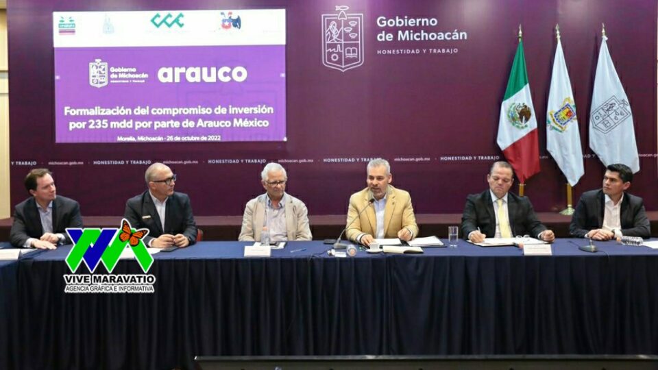 Morelia, Michoacán..- El gobernador Alfredo Ramírez Bedolla y el director general de Arauco, José Manuel Hernández, formalizaron una inversión por 4 mil 700 millones de pesos (235 millones de dólares), para la construcción de una planta de producción de materiales forestales sostenibles para la industria en Zitácuaro.