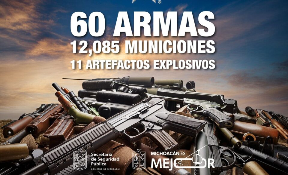 Morelia, Michoacán, 8 de agosto del 2025.- La Secretaría de Seguridad Pública (SSP) en conjunto con autoridades de los tres órdenes de gobierno cerró el mes de julio con el aseguramiento de 60 armas de fuego, 12 mil 085 municiones y 11 artefactos explosivos.