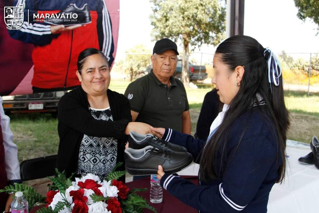 Maravatío, Michoacán.- Se realizó, con la presencia de la Dra. Camelia García Tapia, Secretaria del Ayuntamiento, en representación del H. Ayuntamiento de Maravatío, la entrega simbólica de tenis a estudiantes de la Telesecundaria 20 de Noviembre en Campo Hermoso.