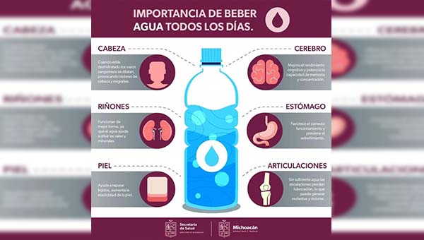 Morelia, Michoacán, 16 de febrero de 2024.- La Secretaría de Salud de Michoacán (SSM) invita a la población a mantenerse hidratada con el consumo diario de 1.5 litros de agua en el caso de niñas, niños y adolescentes; y de dos para los mayores de edad.