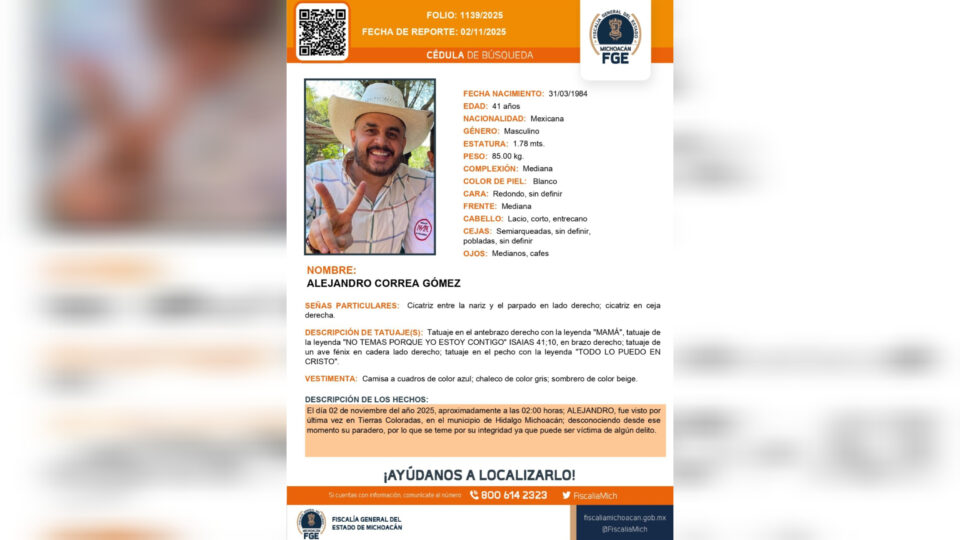 Zitácuaro, Michoacán, a 3 de noviembre de 2025.- La Fiscalía General del Estado de Michoacán (FGE) lleva a cabo acciones de búsqueda e investigación derivadas del reporte de desaparición de Alejandro Correa Gómez, ex presidente municipal de Zinapécuaro.