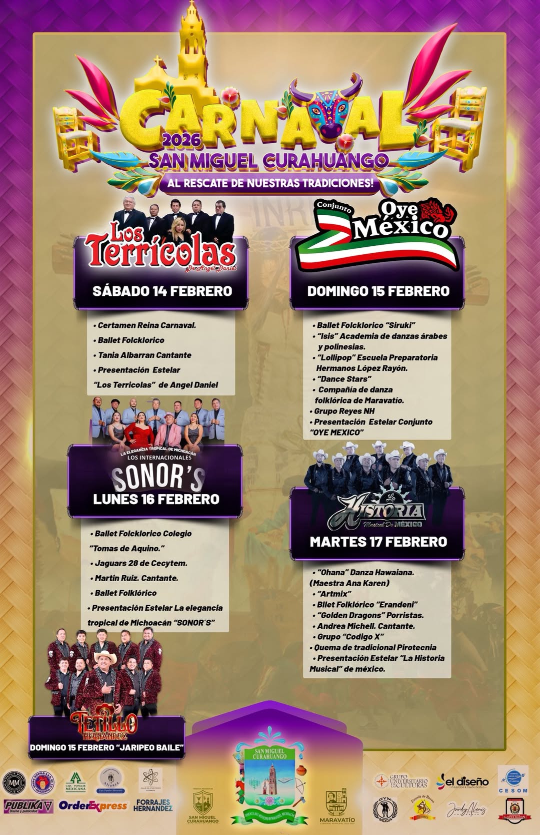 Las actividades darán inicio el sábado 14 de febrero con el tradicional Certamen para elegir a la Reina del Carnaval de San Miguel 2026. Al término del certamen, el público podrá disfrutar de la presentación estelar de Los Terrícolas de Ángel Daniel. Ese mismo día, también se realizarán funciones de lucha libre en el auditorio de la Secundaria Técnica #32 “Emma Palmer”.