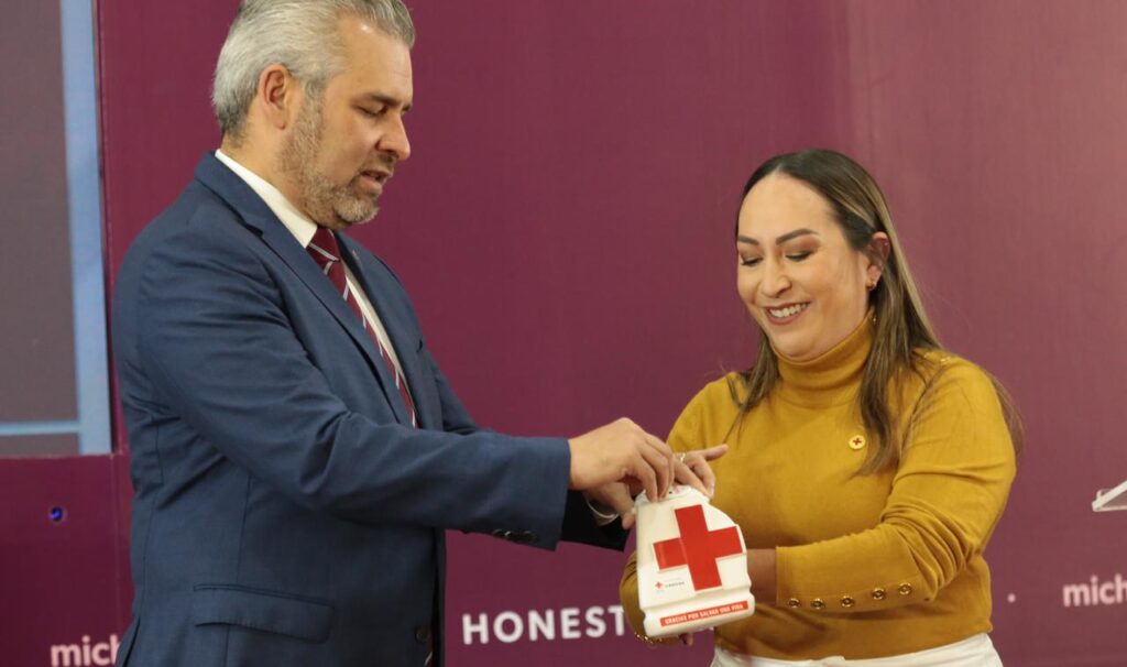 Morelia, Michoacán.- El gobernador Alfredo Ramírez Bedolla, acompañado de la presidenta honoraria del Sistema DIF estatal, Grisel Tello Pimentel, y de Ignacio Gallardo Reyes, delegado de la Cruz Roja Michoacán, exhortó a las y los michoacanos a sumarse a la colecta de la Cruz Roja Mexicana 2022.