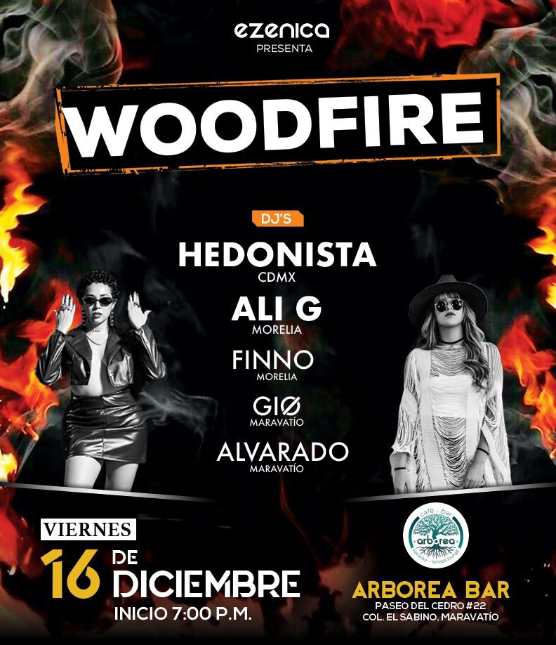 Presentados por ezenica; agencia impulsora de talentos, Arborea Bar y jóvenes amantes de la música; WOODFIRE es un evento sin fines de lucro que brinda un foro a los jóvenes que buscan espacios seguros y adecuados de esparcimiento en esta cultura, los cuales son escasos o nulos en la ciudad, ademas de impulsar y alentar a jóvenes que desean aprender el arte del DJ.