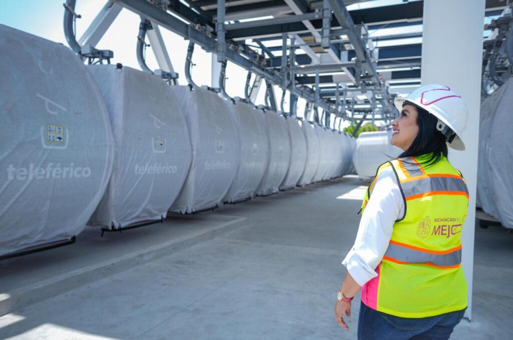 Uruapan, Michoacán, 25 de octubre de 2025.- La secretaria de Desarrollo Urbano y Movilidad, Gladyz Butanda Macías, informó que dio inicio el traslado de cabinas del teleférico de Uruapan, una vez que la instalación del tendido de cable se completó en un 100 por ciento.
