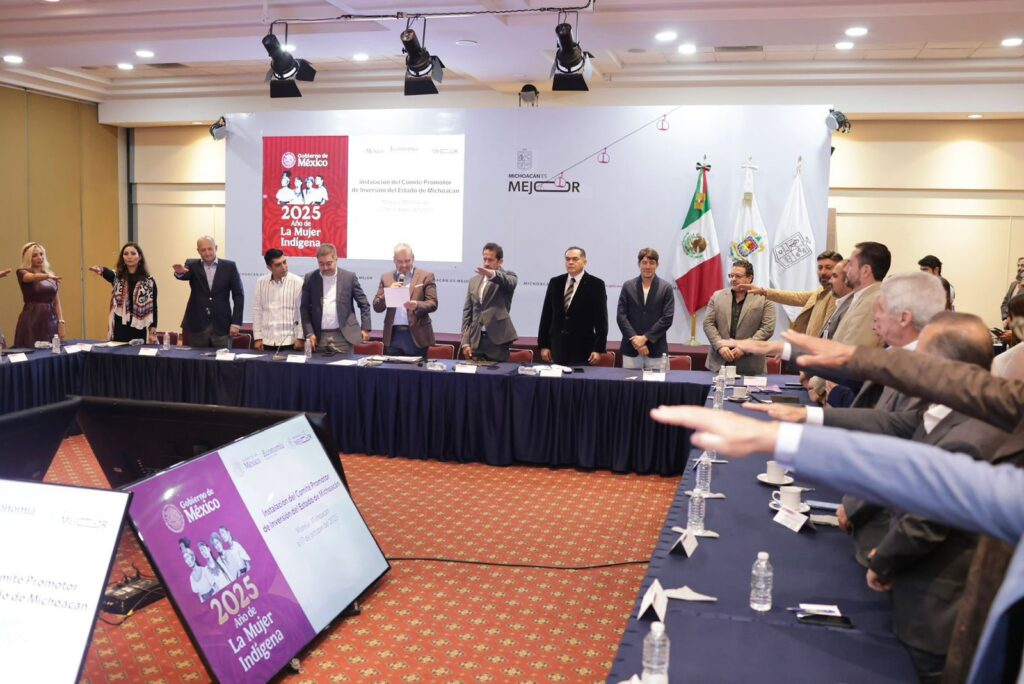 Morelia, Michoacán, 17 de octubre de 2025.– El gobernador Alfredo Ramírez Bedolla instaló y tomó protesta a los integrantes del Comité Promotor de Inversiones de Michoacán, quienes aprobaron firmar y enviar a la presidenta Claudia Sheinbaum Pardo, un pronunciamiento para mostrar respaldo del sector productivo y empresarial a su política económica y a las negociaciones que vendrán del nuevo Tratado entre México, Estados Unidos y Canadá (T-MEC) en 2026.