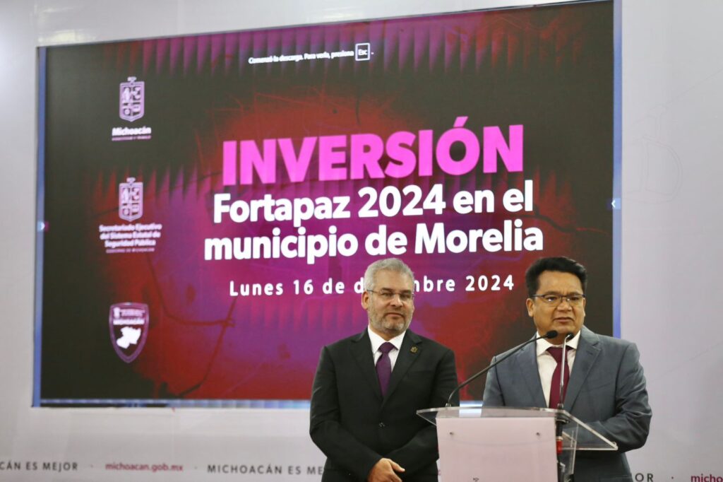 Morelia, Michoacán, 16 de diciembre de 2024.– Durante el presente año en el municipio de Morelia se invirtieron 30 millones 50 mil 908 pesos del Fondo para el Fortalecimiento para la Paz (Fortapaz), en diversas acciones para la recuperación de espacios públicos y robustecer los esquemas de seguridad pública, así lo explicó César Erwin Sánchez Coria, titular del Secretariado Ejecutivo del Sistema Estatal de Seguridad Pública (SESESP).