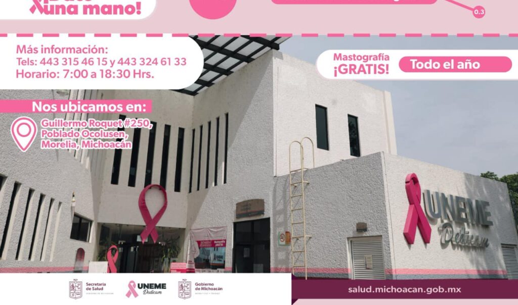 Morelia, Michoacán.- En el mes de la sensibilización contra el cáncer de mama, la Secretaría de Salud de Michoacán (SSM) invita a las mujeres de más de 40 años a realizarse la mastografía, acudiendo a la Unidad de Especialidades Médicas en Detección y Diagnóstico de Cáncer de Mama (Uneme Dedicam), en la ciudad de Morelia.
