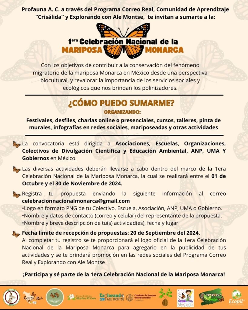 Tienes hasta el 20 de septiembre de 2024 para registrar tu propuesta, enviando la información que viene en la convocatoria al correo celebracionnacionalmonarca@gmail.com.