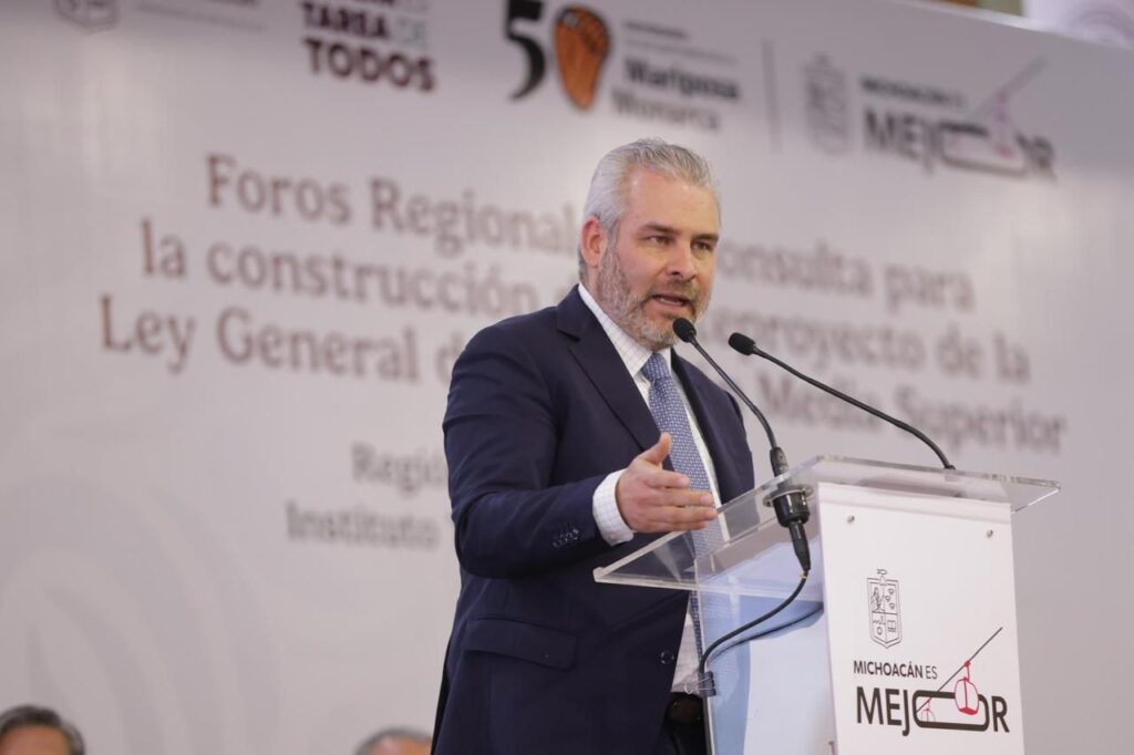 Para el foro que contó con presencia de cinco estados de la República, el gobernador de Michoacán recibió a Tania Rodríguez Mora, subsecretaria de Educación Media Superior de la SEP, junto a la secretaria de Educación en Michoacán, Gaby Molina y a la directora del Instituto de Educación Media Superior y Superior del Estado de Michoacán, Mariana Sosa.