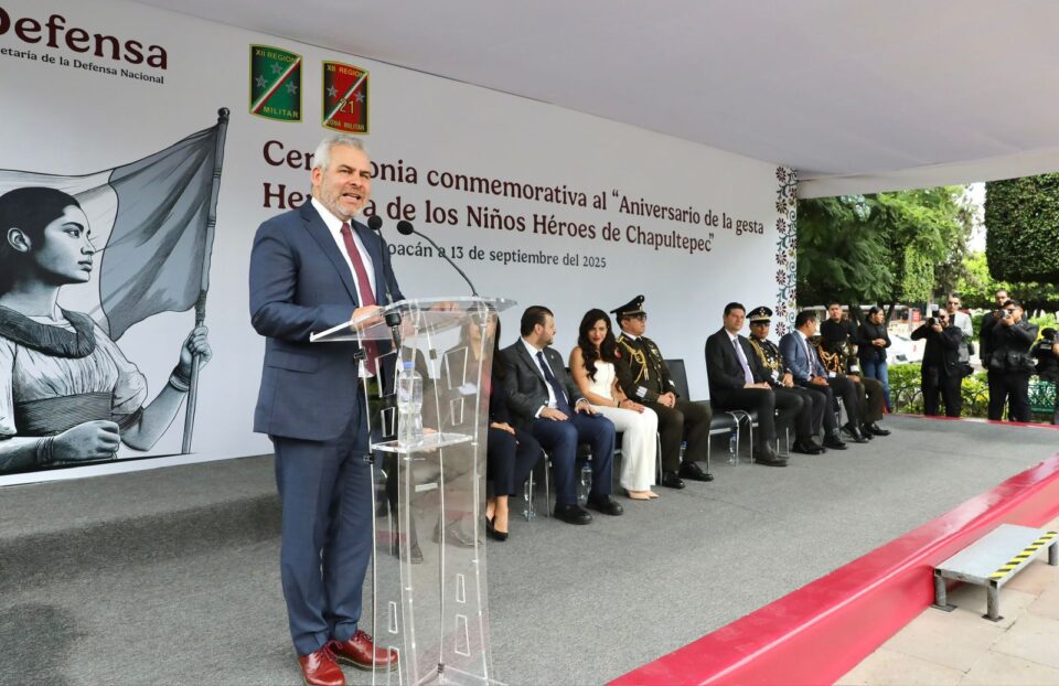 Morelia, Michoacán, 13 de septiembre de 2025.- El gobernador Alfredo Ramírez Bedolla hizo un llamado a seguir el ejemplo de valentía y patriotismo de los Niños Héroes de Chapultepec para defender la soberanía de México con firmeza y enfrentar cualquier amenaza con ideas, capacidades, diplomacia y diálogo.
