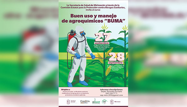 Morelia, Michoacán.- Para prevenir las intoxicaciones en los jornaleros agrícolas, personal sanitario, distribuidores de agroquímicos, y fabricantes de fertilizantes, la Secretaría de Salud de Michoacán (SSM), a través de la Comisión Estatal para la Protección contra Riesgos Sanitarios (Coepris) realizará los próximos 27 y 28 de septiembre el curso “Diagnóstico y tratamiento oportuno por intoxicación por uso de agroquímicos”.