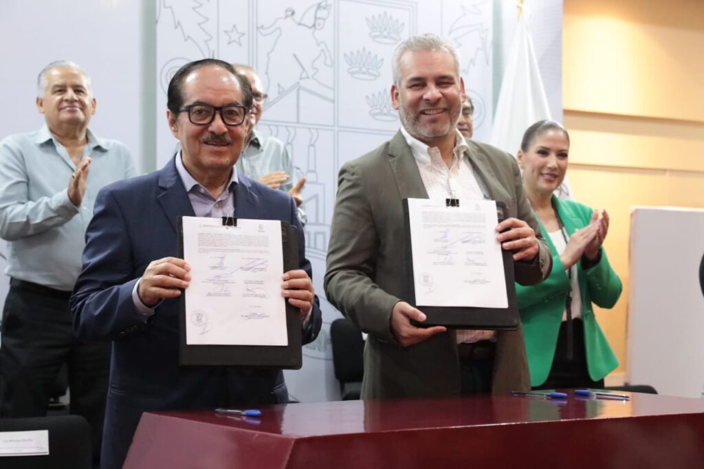 Morelia, Michoacán, 21 de agosto de 2024.-El gobernador Alfredo Ramírez Bedolla señaló que Michoacán no será omiso en la defensa de los bosques, tras formalizar el Convenio de Coordinación para la Asunción de Funciones en Materia de Sanidad Forestal con la Comisión Nacional Forestal (Conafor), con lo que se faculta a las autoridades estatales a coordinarse en la atención oportuna para el control de plagas y enfermedades forestales.