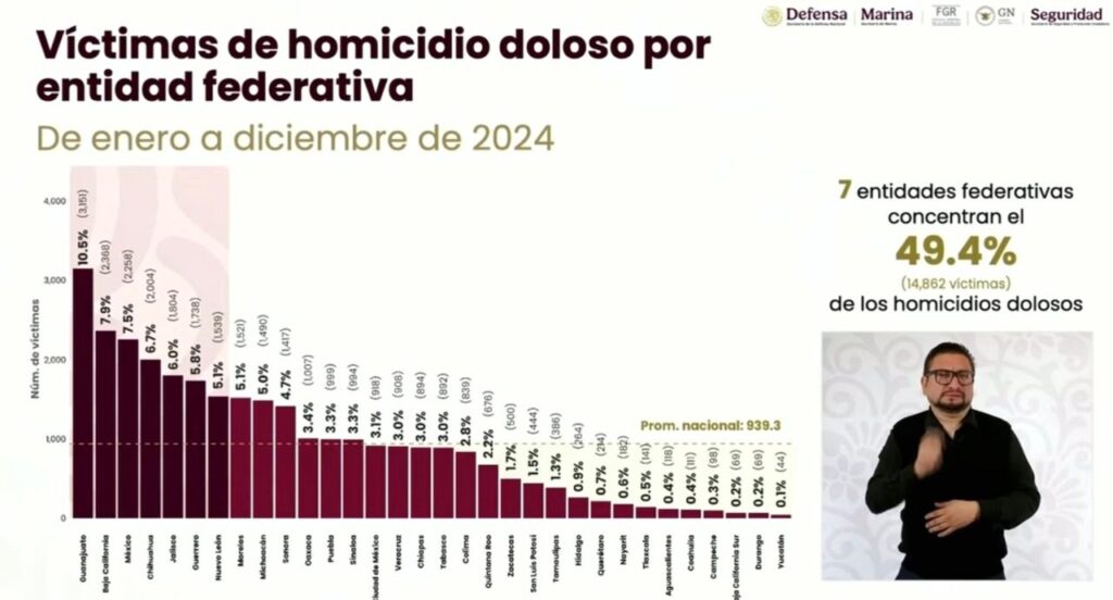 Durante la conferencia de la presidenta Claudia Sheinbaum Pardo, la titular del Sistema Nacional de Seguridad Pública refirió que dicho porcentaje equivale a 14 mil 862 víctimas que ocurrieron en estas siete entidades.