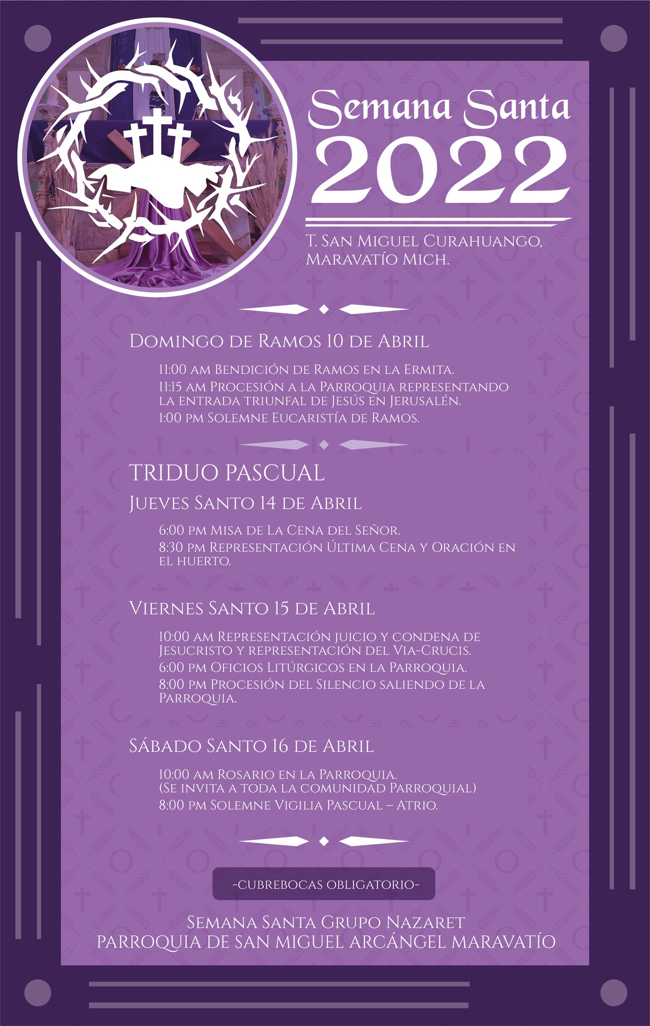 Maravatío, Michoacán.- La Parroquia de San Miguel Arcángel en la Tenencia de San Miguel Curahuango dio a conocer las actividades que se realizarán de manera presencial en la semana santa, se pide acudir con cubrebocas