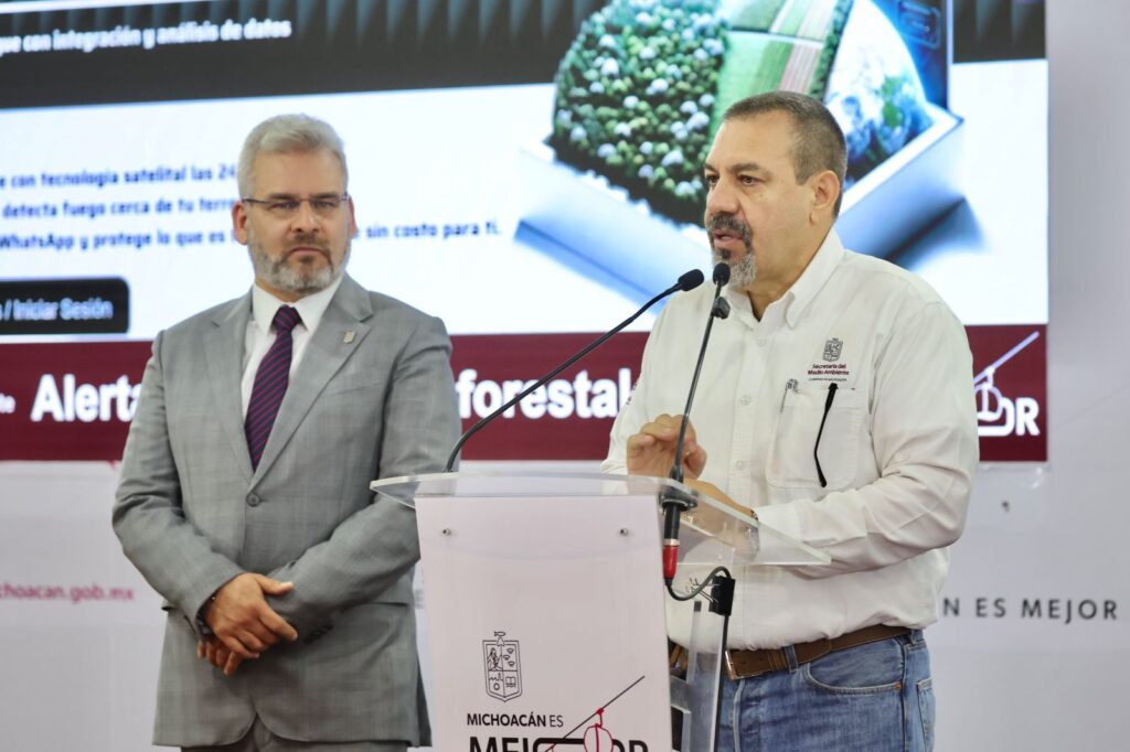 Morelia, Michoacán, 12 de mayo del 2025.- El sistema de vigilancia satelital Guardián Forestal lanzó una nueva función para contribuir con propietarios de predios para proteger sus terrenos contra incendios, enviando alertas en caso de siniestro mediante WhastApp, así lo dio a conocer el secretario del Medio Ambiente, Alejandro Méndez López.