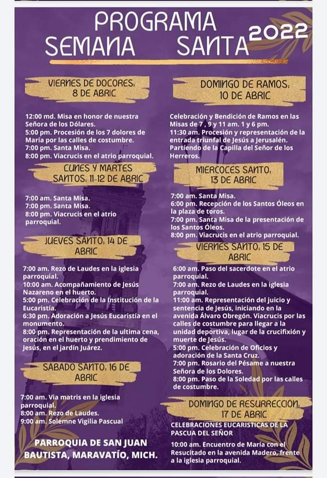 Maravatío, Michoacán.- La parroquia de San Juan Bautista, en el centro de Maravatío, dió a conocer el programa de las actividades que se realizarán por la semana santa.
