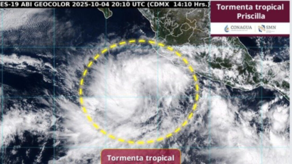 A las 15:00 horas, tiempo del centro de México, se formó la tormenta tropical Priscilla, en el océano Pacífico. Su centro de localizó a 460kilómetros al sur-suroeste de Manzanillo, Colima, con vientos máximos sostenidos de 75 kilómetros por hora (km/h), rachas de 95 km/h y desplazamiento hacia el noroeste a 11 km/h.