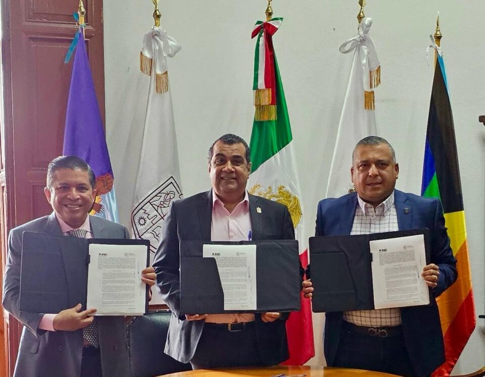 El secretario de Gobierno, Elías Ibarra Torres; el vocal Ejecutivo del Instituto Nacional Electoral (INE), David Alejandro Delgado Arroyo; y el coordinador del Sistema Penitenciario de Michoacán, Ignacio Mendoza Jiménez, firmaron un convenio de colaboración para facilitar y llevar este derecho a los centros penitenciarios.