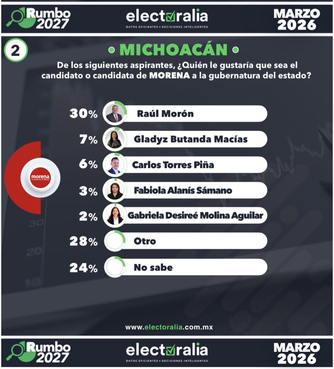 Morelia, Michoacán. – Con un contundente 30% de las preferencias, el senador Raúl Morón Orozco se despega de sus competidores y se consolida como el virtual candidato de Morena a la gubernatura para 2027, al marcar distancia de perfiles como Gladyz Butanda y Carlos Torres Piña, quienes apenas alcanzan el 7% y 6% respectivamente, lo que confirma que el legislador es la figura con mayor arrastre y capacidad de unidad dentro del movimiento de la Cuarta Transformación en la entidad.