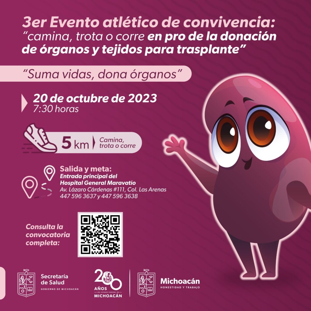 Morelia, Michoacán, 21 de septiembre de 2024.– El próximo 20 de octubre la Secretaría de Salud de Michoacán (SSM) llevará a cabo por tercera ocasión su evento atlético de convivencia Camina, trota o corre, a favor de la donación de órganos y tejidos para trasplante, en el municipio de Maravatío.