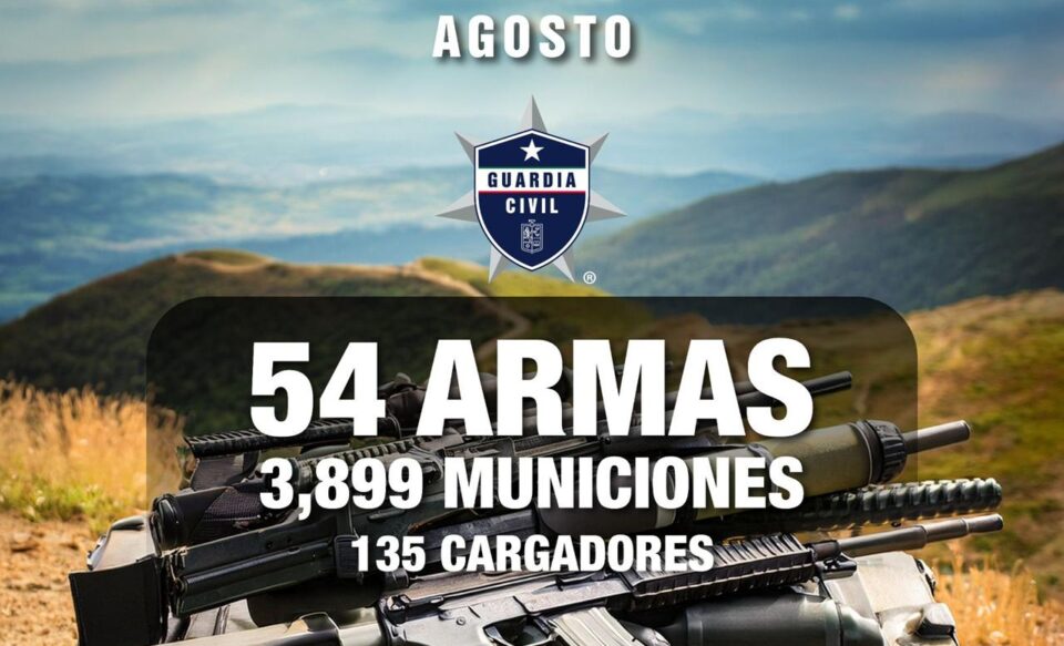 Resultado de los operativos coordinados entre la Guardia Civil, la Secretaría de la Defensa Nacional (Defensa) y autoridades estatales, se logró el decomiso de 30 armas largas y 24 cortas, además de 135 cargadores y 3 mil 899 municiones.
