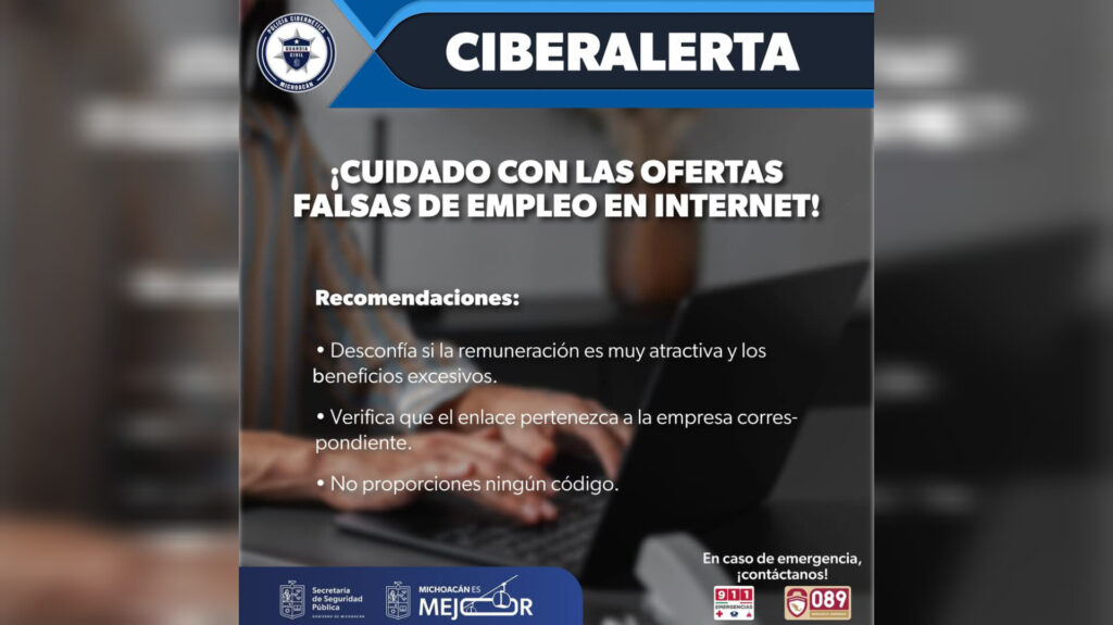 Morelia, Michoacán, 10 de enero de 2025.- La Secretaría de Seguridad Pública (SSP), a través de la Policía Cibernética, emitió la siguiente ciberalerta para que usuarios de internet no acepten ofertas de trabajo falsas, mediante anuncios en Google.