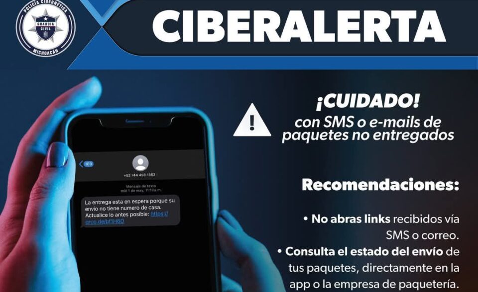 Morelia, Michoacán, 27 de mayo del 2025.- La Secretaría de Seguridad Pública (SSP) emite una ciberalerta para advertir a los usuarios de internet sobre el riesgo de abrir enlaces en mensajes de texto o correos electrónicos que informan sobre supuestos paquetes no entregados.