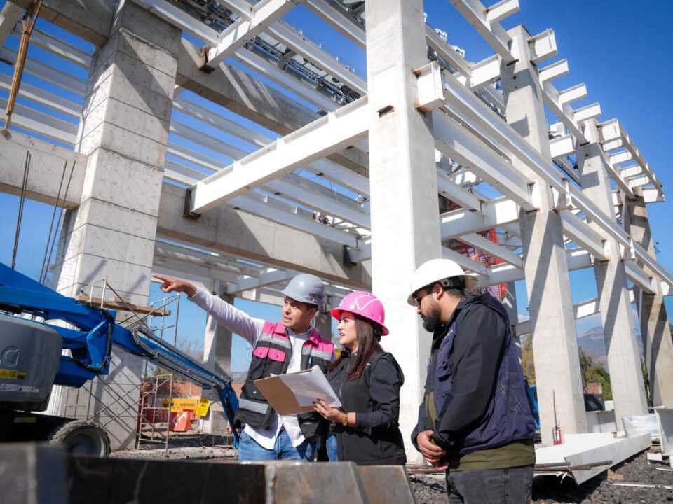 Morelia, Michoacán, 12 de febrero de 2026.- La secretaria de Desarrollo Urbano y Movilidad, Gladyz Butanda Macías, supervisa la construcción del garaje donde se almacenarán las cabinas del teleférico de Morelia, en la Estación 1 del Estadio Morelos.