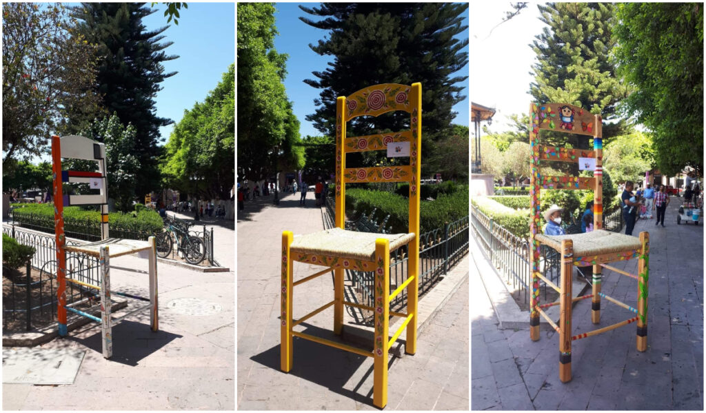 Maravatío, Michoacán.- El colectivo Pro-Arte Maravatío en coordinación con artesanos, colocaron sillas monumentales en el Jardín Melchor Ocampo en el marco del cierre del 1er Festival de la Silla.