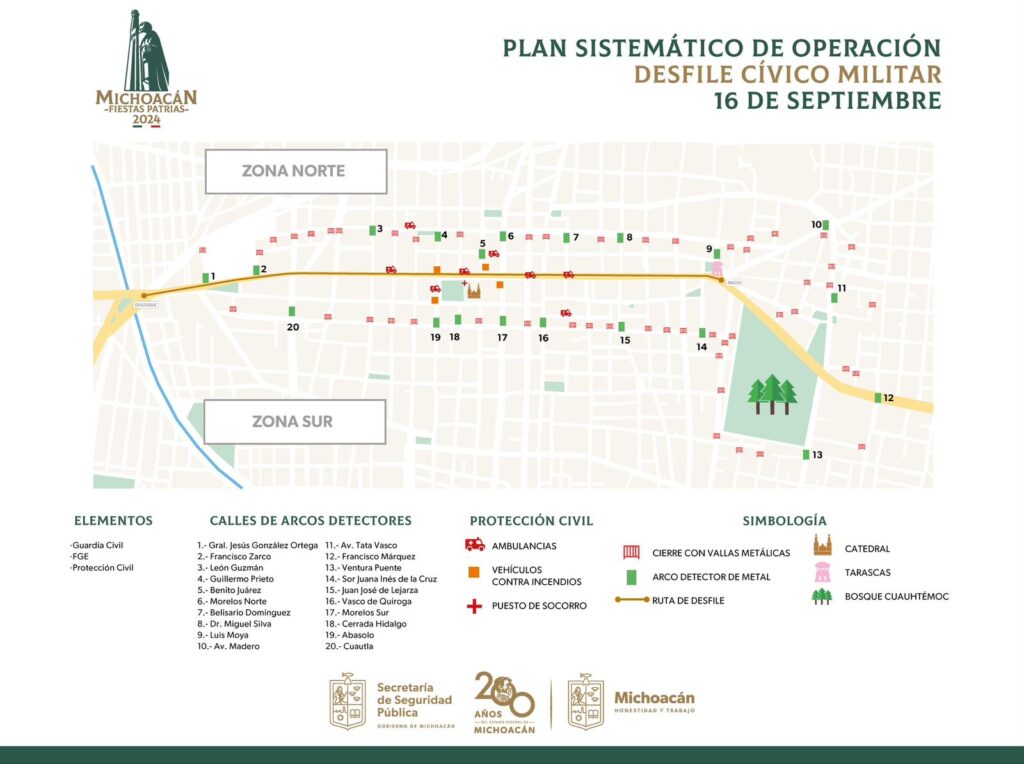 Morelia, Michoacán, 15 de septiembre del 2024.- La Secretaría de Seguridad Pública (SSP) informa a las y los asistentes a las Fiestas Patrias 2024, los 20 accesos donde se cuenta con arcos detectores de metal y de rayos X, por los cuales podrán ingresar al Centro Histórico de Morelia para disfrutar del desfile Cívico-Militar por el CCXIV aniversario de la Independencia de México.
